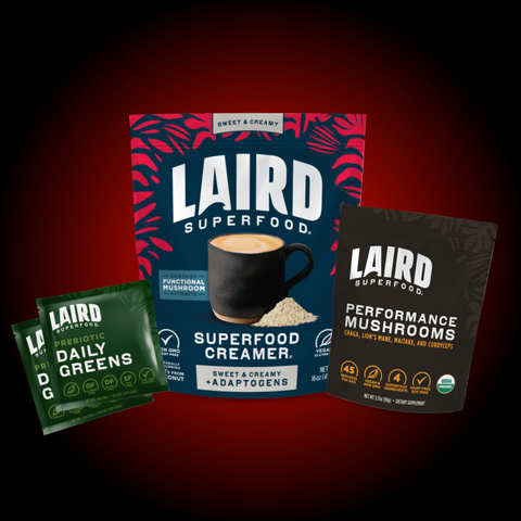 Gabby, Laird and Shawn share a common belief that you need to fuel your best performance with the best ingredients in the world. This bundle was designed by them all to achieve exactly that. A morning glass of Daily Greens delivers over 22 superfood ingredients and minerals, our Sweet and Creamy + Adaptogen Superfood Creamer will help you maintain balance during times of stress, and just one teaspoon of Performance Mushrooms in your favorite recipe will help power up your performance when you need it most.